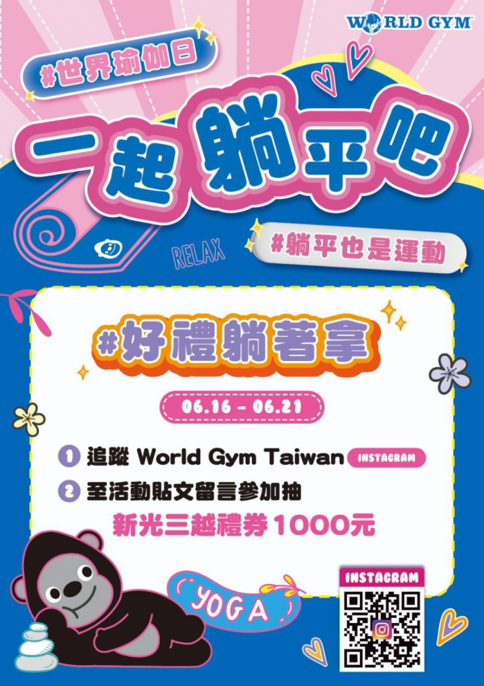 廖容瑩並表示,World Gym響應6月21日國際瑜珈日,以「躺平也是運動」為主題,推出「世界瑜珈日—【瑜珈x耍廢伸展】主題課程」,鼓勵民眾以更親切、放鬆的方式,把瑜珈融入日常生活,讓身體與心靈重新啟動!