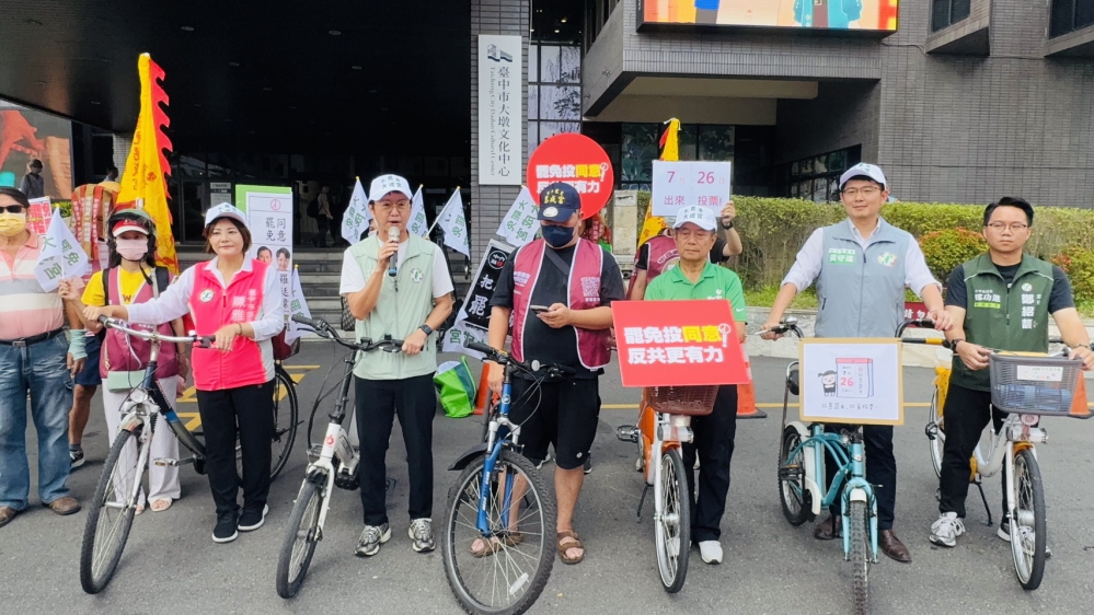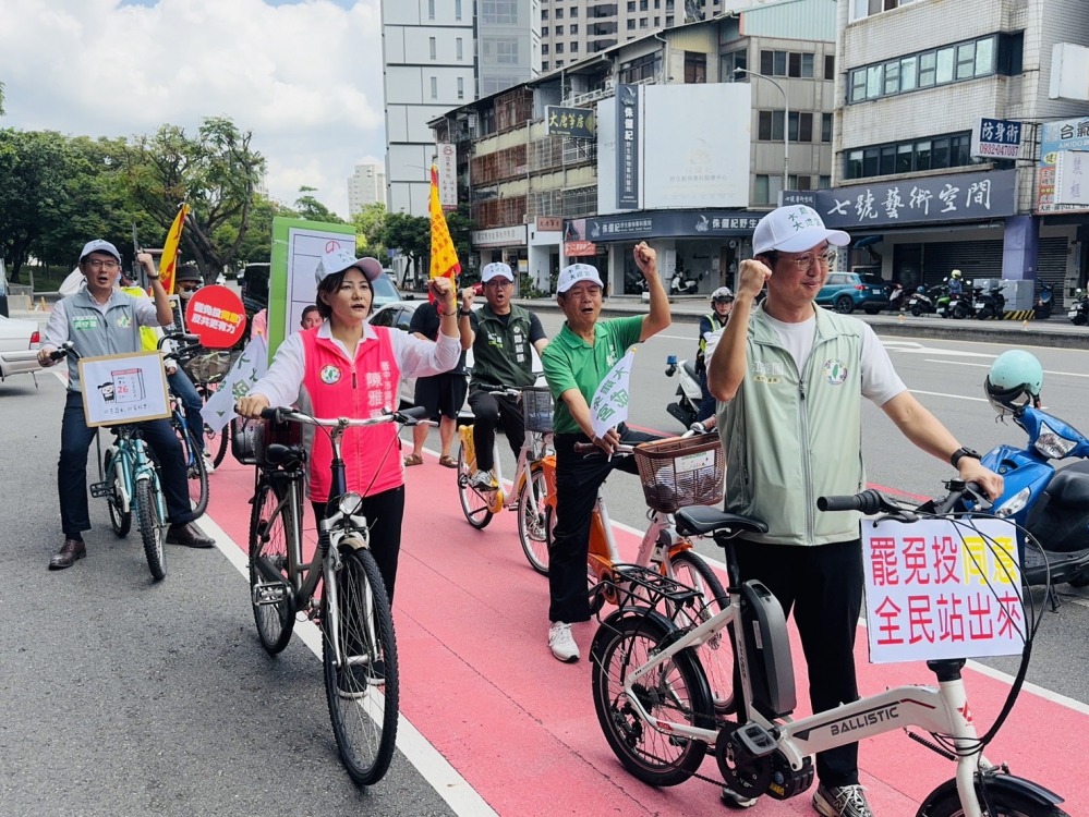 【記者林獻元台中報導】中央選舉委員會20日公告罷免24位國民黨立委案成立,其中包含台中市第六選區羅廷瑋案,訂於7月26日舉行投票。台中四位在地市議員江肇國、鄭功進、陳雅惠、黃守達21日上午響應民進黨中央舉行「罷免投同意.全民站出來」單車宣傳行動,號召市民挺身而出,以選票終結亂政,讓不適任的立委下台負責。