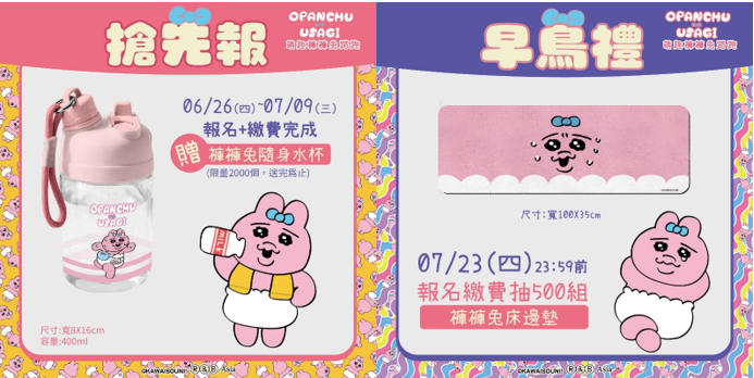 搶先期報名,即可獲得限量「褲褲兔隨身水杯」2000個;早鳥階段報名,還可以參加抽獎活動,就有機會將超實用、限量500組的「褲褲兔床邊墊」帶回家。