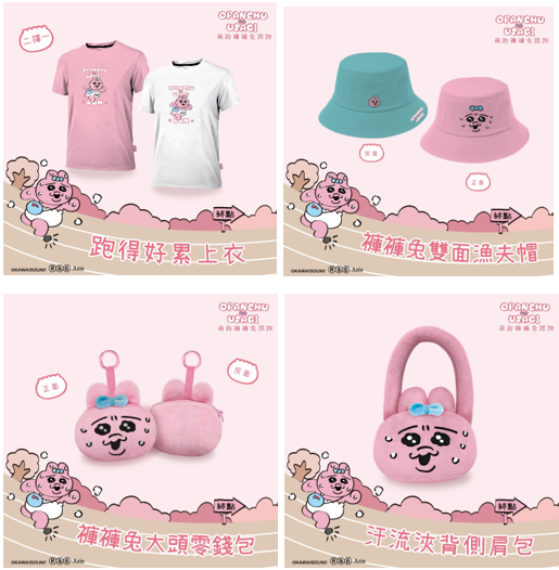 萌趣褲褲兔路跑物資設計兼具可愛與實用,包括舒適的「跑得好累上衣」、兩種風格的「雙面漁夫帽」,以及方便隨手收納的「大頭零錢包」,還有解放雙手的「奮力向前手機夾片」、多功能「氣喘吁吁造型浴巾」、療癒的「奔跑褲褲兔鑰匙圈」、實用的「汗流浹背側肩包」等,每一項物資都讓人充滿快樂與陪伴。