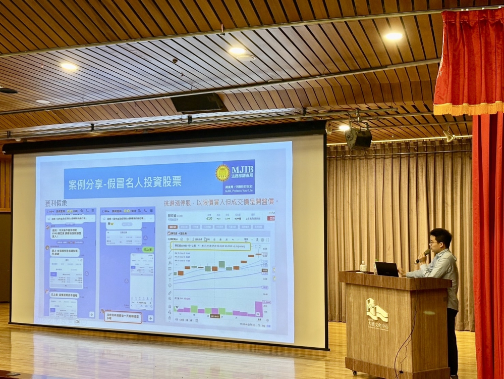 調查官楊道函結合第一線偵查經驗,帶領民眾認識新型詐騙手法,包括利用AI技術生成的深偽影音、假冒名人或親友身分傳送詐騙訊息,及以高報酬為誘餌的虛假投資平台等。透過實際案例與影音畫面,生動揭露詐騙集團話術與設局手法,協助民眾提升防詐警覺力。