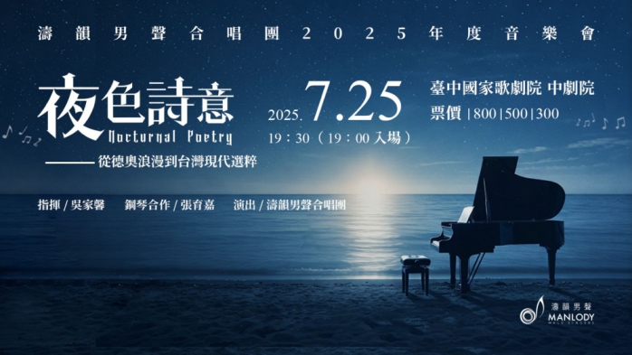 濤韻男聲合唱團集結中臺灣熱愛合唱藝術的男性歌手,年度音樂會《夜色詩意》以男聲合唱深沉細緻的音色,展開一場橫跨歐洲與臺灣的音樂旅程。上半場完整呈現舒伯特即興合唱作品,可聽見作曲家對聲音層次與情感描繪的細膩掌握。下半場則轉向臺灣的流行音樂,在〈外婆的澎湖灣〉、〈但願人長久〉、〈向前走〉等經典作品中,重新詮釋從民歌運動至新台語歌的文化脈絡。合唱團指揮吳家馨表示,濤韻是中部第一個立案的男聲合唱團,2016年成立至今,提供一個練唱的平台,全團現在將近40名男性團員,以專屬男聲的方式呈現合唱藝術之美。今天記者會特別出動12名團員,演唱舒伯特經典作品〈音樂頌〉,為現場帶來優雅浪漫、平靜心靈的聲音。7月25日歡迎來中劇院感受跨文化男聲合唱魅力。