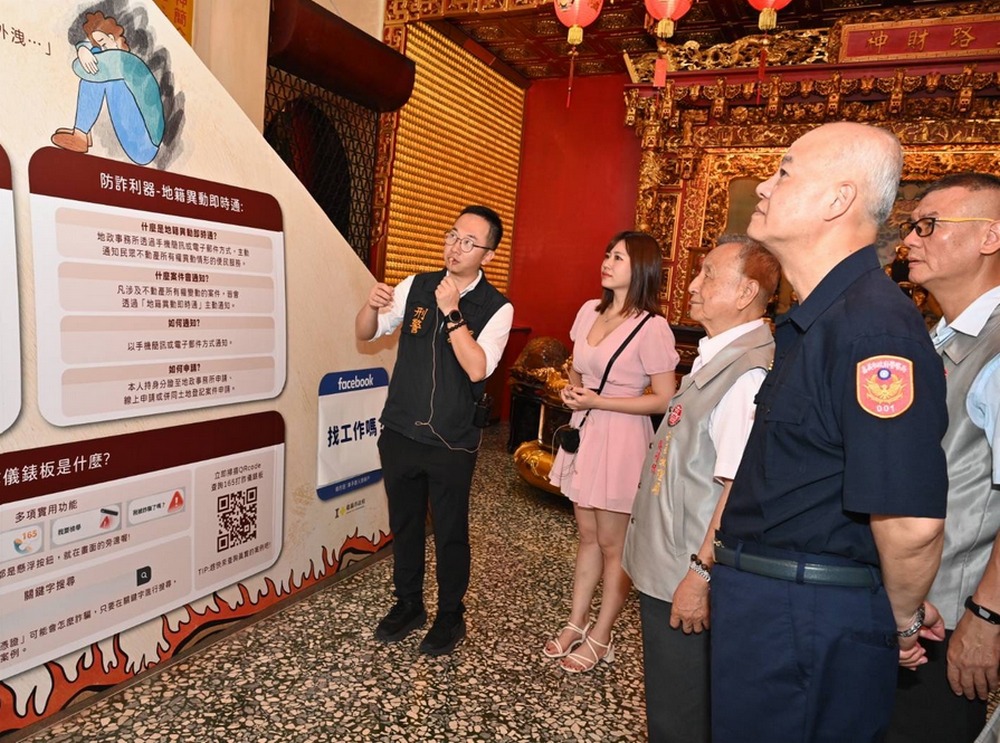 嘉義市政府警察局與三百年信仰重地嘉義城隍廟再度攜手, 自7月3日起於城隍廟內推出《神明看透識詐騙》防詐行動特展。(圖/嘉義市警察局提供)