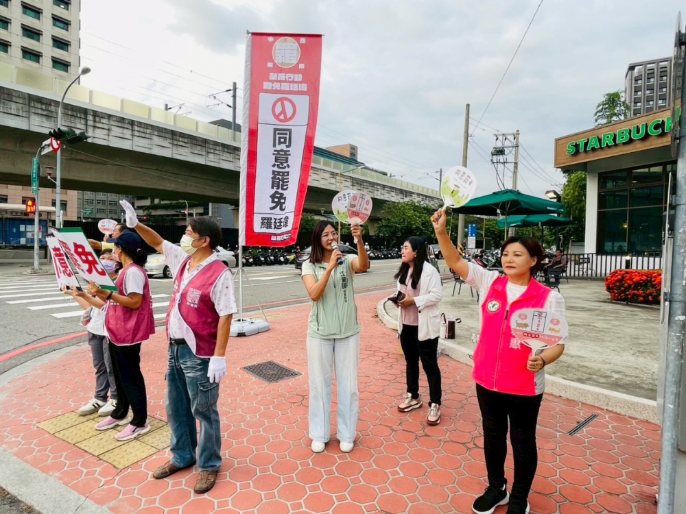 陳雅惠身穿桃紅色背心,站在街頭重要路口與罷團志工們高舉「同意罷免」看板,向來往民眾拜票、高喊「出來投票、讓羅廷瑋下台!」她說,這不只是罷免不適任立委,更是為了守住台灣的民主制度。