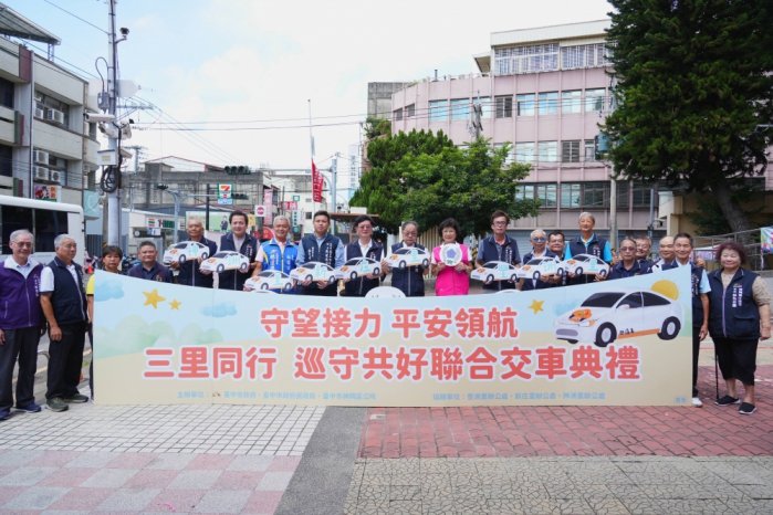 【記者林獻元台中報導】台中市神岡區神洲里、新庄里及豐洲里守望相助隊車齡老舊,日夜巡邏造成性能耗損,考量隊員巡守安全及機動性,市府補助3里新購巡邏汽車各1輛,30日在神岡區公所前廣場舉行聯合交車典禮。民政局長吳世瑋主持交車儀式,感謝里隊無私奉獻,維護地方治安平穩,期盼全新巡邏車強化隊員執勤安全性,提升里隊巡守戰力。