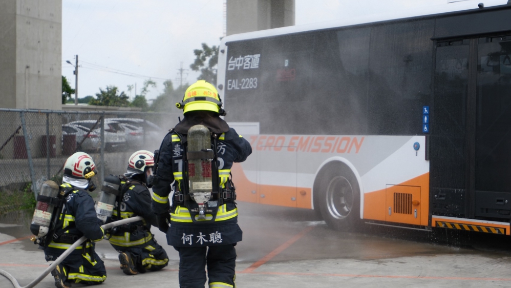 但面對電動公車與傳統車輛不同的防災特性,更需強化救災應變機制,交通局今日攜手消防局在台中客運省議會調度站舉行消防演練,實地演練電動公車於充電作業中發生異常狀況,如何滅火搶救的應變流程。