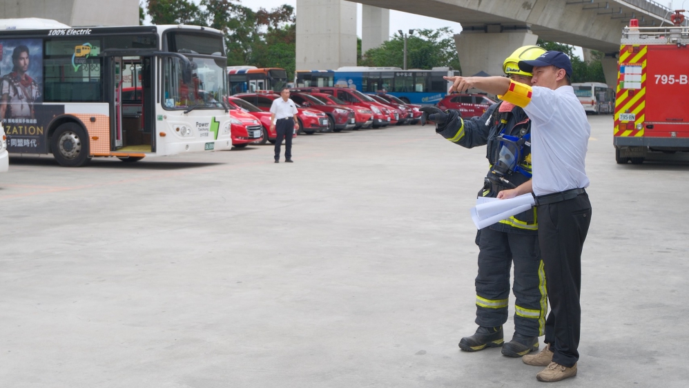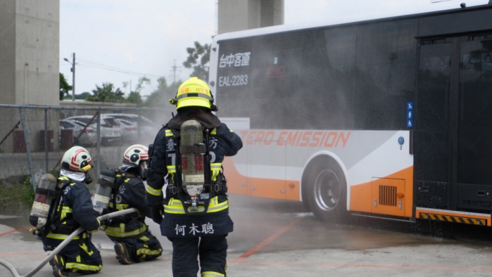 為確保市民搭車安全無虞,交通局每年辦理擴大消防演練,要求客運業者落實自主消防演練,針對車上緊急逃生設備操作、滅火器使用、起火應變、乘客疏散引導等項目進行演練,邁向綠色運輸、強化救災協同發展。