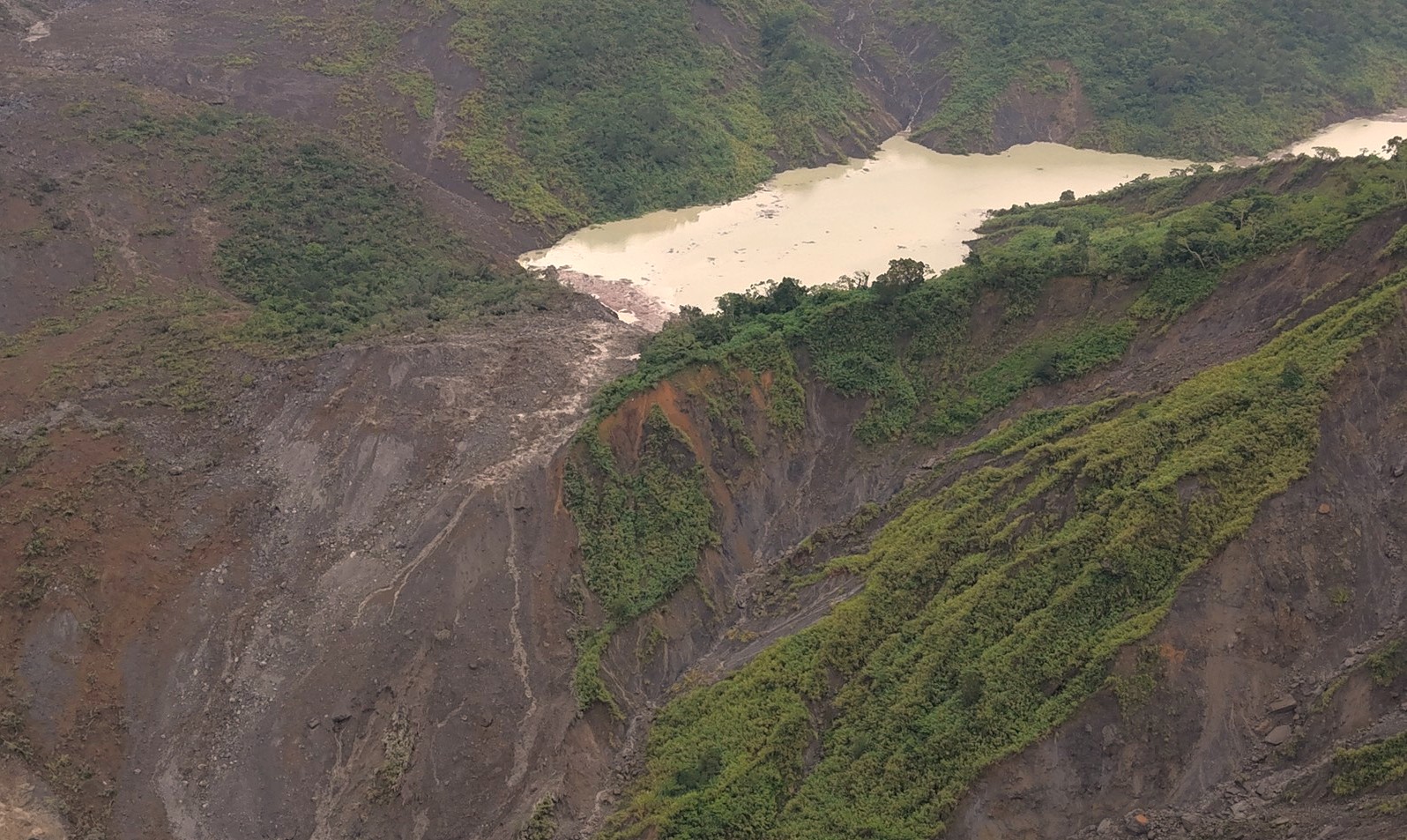 受颱風丹娜絲豪雨影響,雲林縣古坑鄉草嶺村發生邊坡滑落,造成清水溪河道阻塞並形成堰塞湖。(圖/記者蘇峯毅翻攝)