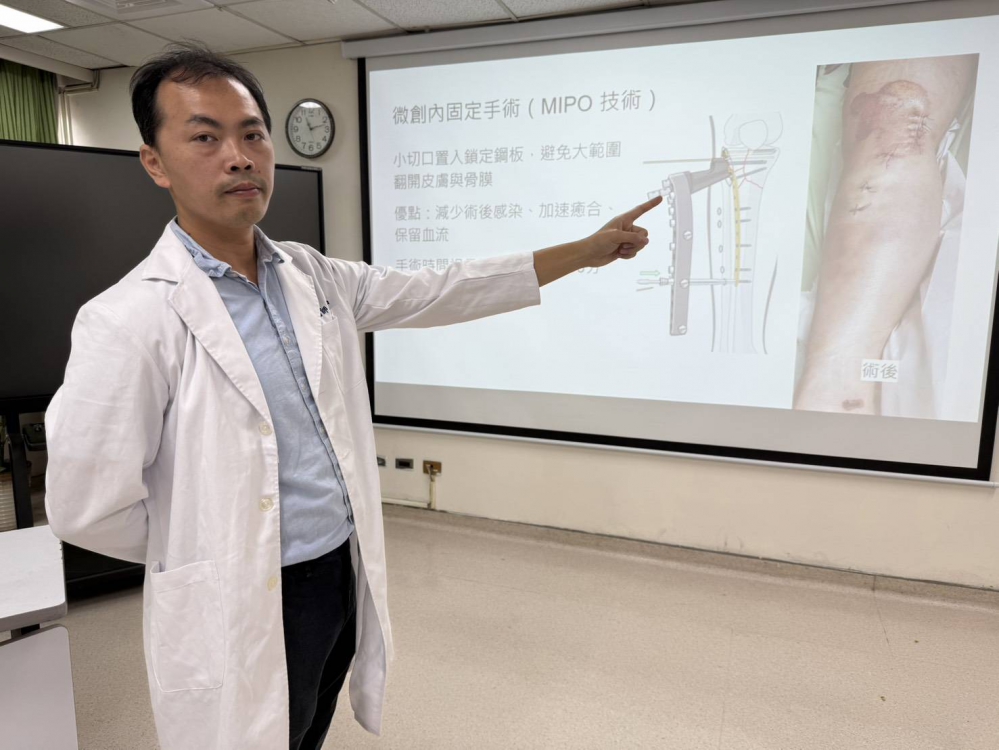 衛生福利部臺中醫院骨科醫師周育名表示,陳女自述,先生騎車載她,不料,遭突然轉彎的機車擦撞,先生只有擦傷,她卻重摔骨折。到院時,右腳脛骨骨折合併擦挫傷,評估她平日愛漂亮與工作需求,在送達急診室後六小時,就幫她進行微創內固定手術,手術隔天,就能下床以助行器自行走路上廁所,接著團隊安排十次高壓氧治療,協助患者傷口迅速復原,並進行復健治療,讓她出院後穿裙子不怕有難看大傷疤,日後還可以跟姊妹繼續搶攻百貨周年慶。