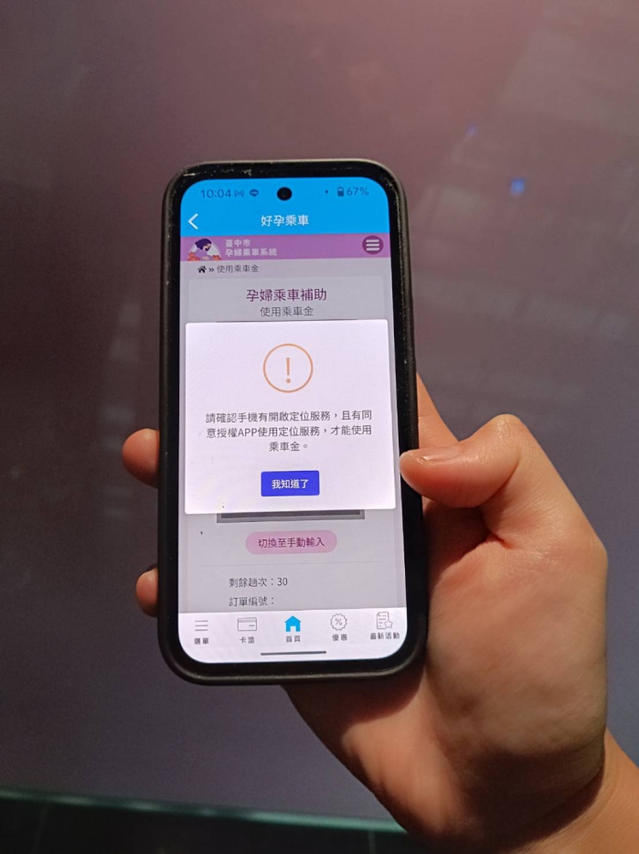 數位局提醒,近期有孕媽咪反映在使用「好孕乘車補助」時,畫面出現「請確認手機已開啟定位服務,並授權APP存取位置資訊」的提醒訊息。數位局說明,好孕專車補助限定中部四縣市(中、彰、投、苗)地區使用,為確認使用者所在地,請孕媽咪務必開啟手機定位服務,並允許APP存取位置資訊,才能順利使用乘車金、安心搭車!