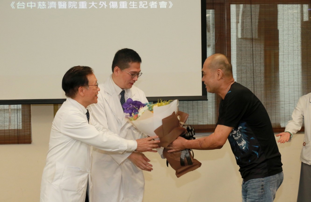 【記者張原銘、張皓傑台中報導】62歲胡先生今年3月在工地遭300公斤鋼樑重壓,全身重創,一度命危。台中慈濟醫院動員14個醫療科別、19位醫師及護理團隊接力搶救,住院72天、輸血超過24,000c.c.,治療72天終於從鬼門關康復出院。台中慈濟醫院15日為胡先生舉辦重生慶祝會,見證這場醫療團隊與病人共同奮戰的奇蹟。