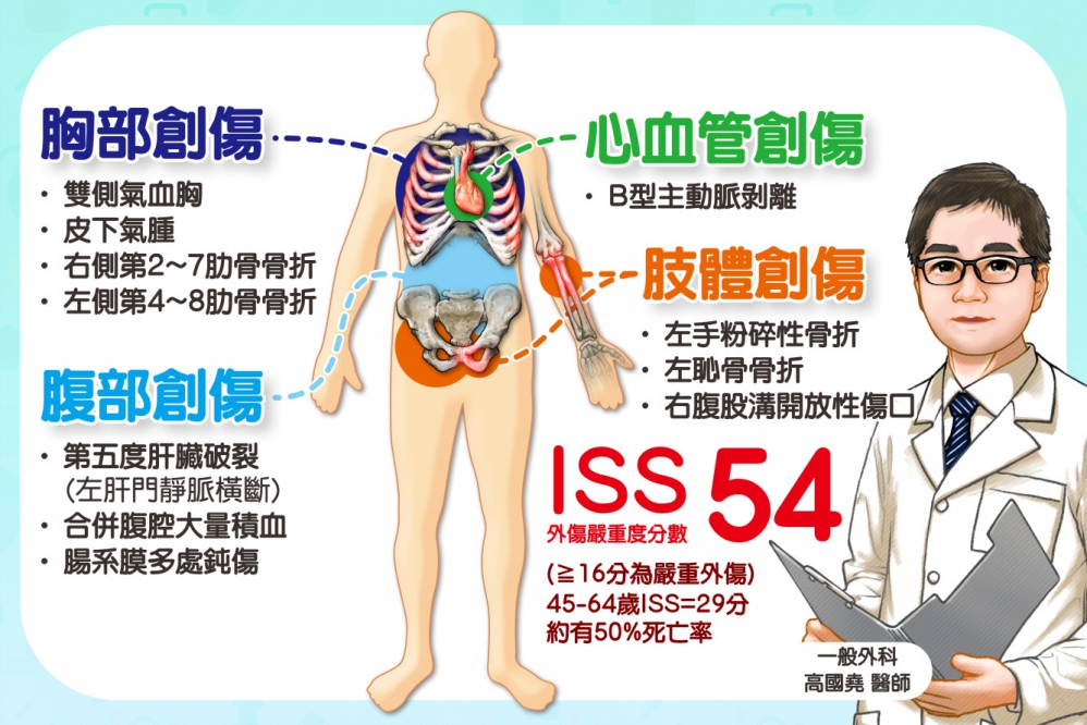 一般外科主治醫師高國堯說明救治整個過程時表示,胡先生送抵醫院急診已出現休克、意識不清等危急症狀,檢查發現肋骨多處骨折併發氣胸與血胸、肝臟左葉撕裂、大腸挫傷潰爛,骨盆與左手粉碎性骨折,全身創傷遍及胸腹腔與四肢。依外傷嚴重度分數(ISS)高達54分,換算年紀的致死率幾乎生還渺茫。