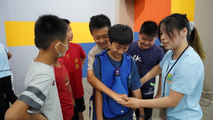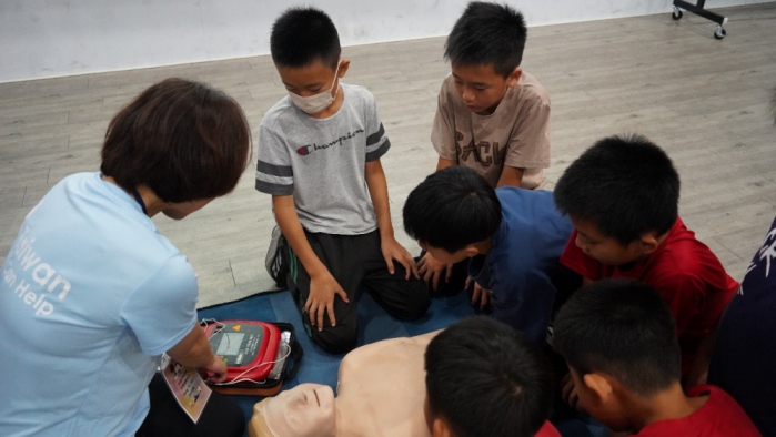 活動以志工隊青春洋溢的開場舞揭開序幕,緊接著透過趣味短劇《黃金五分鐘》,讓孩子們輕鬆了解急救的重要性。課程內容涵蓋心肺復甦術(CPR)、哈姆立克法及自動體外心臟去顫器(AED)使用方式,並安排小組實作演練,讓小朋友在操作中加深理解、提升臨場反應能力,展現高度的學習參與及自我保護意識。