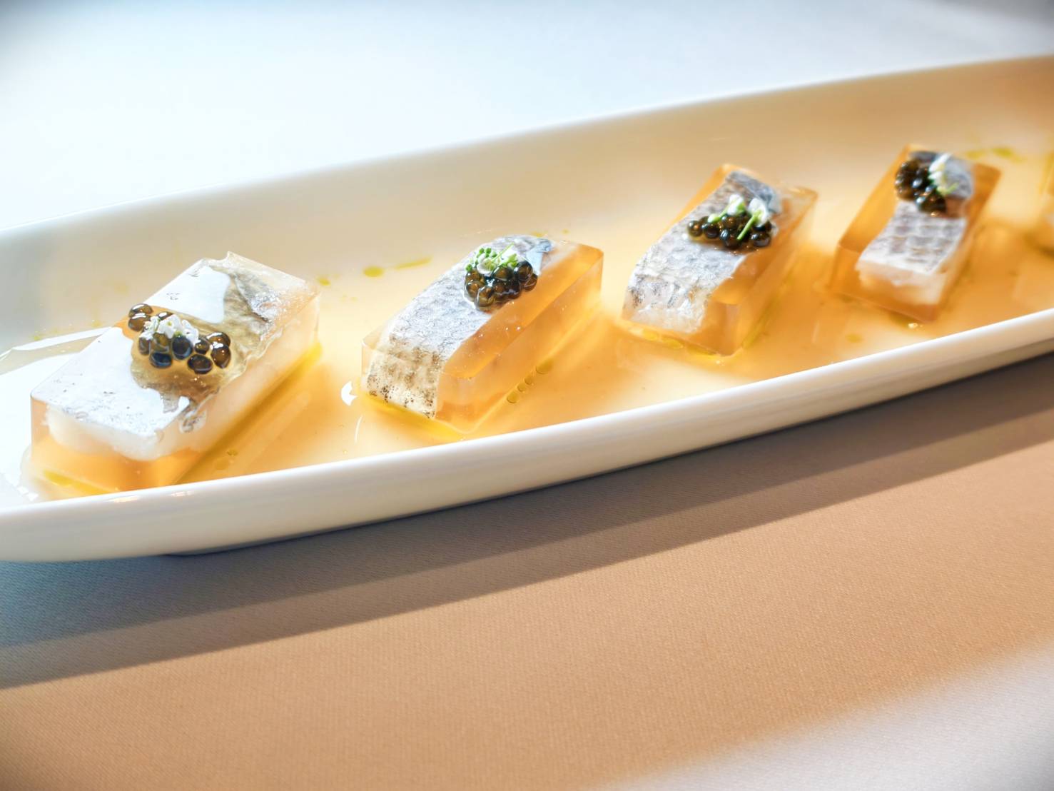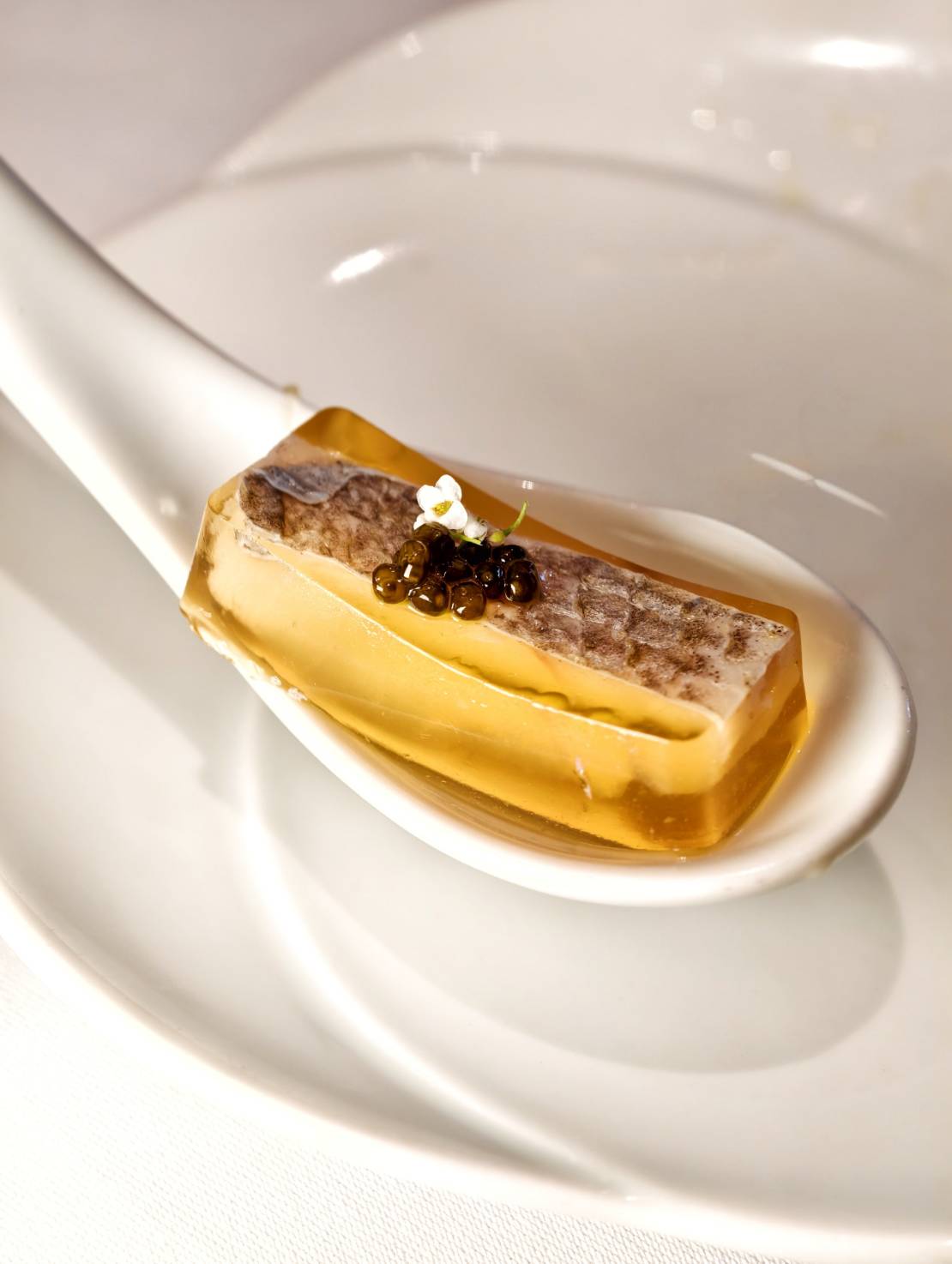 每年5、6月,黃魚膠質飽滿、脂香滑嫩,是品嚐的最佳時節。天香樓「黃魚宴」以一道絕美的「黑珍珠醉黃魚凍」揭開餐期序幕,半透明魚凍色澤清亮,在燈光照耀下,散發出金黃色通透感,靈感來自江南經典醉黃魚,低溫舒肥魚肉與紹興陳年老酒入凍,表層鋪上魚皮妝點,搭配魚子醬畫龍點睛,淺嚐一口,冰涼魚凍入口即化,濃郁酒香充斥舌尖,醉香不醉人。
