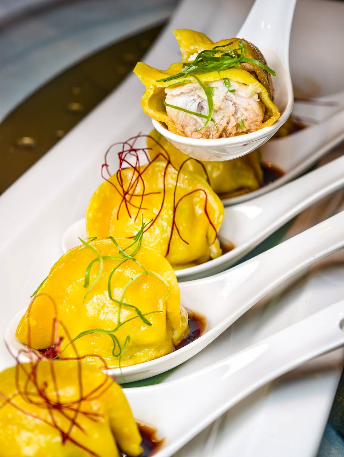 近年少見的黃魚水餃,也成為今晚座上賓,或許是因為黃魚珍稀、產量少,加上價格高昂,我已多年不曾在台灣嚐到黃魚水餃,天香樓不計成本,端出「黃魚金元寶」讓人眼前一亮,圓滾滾水餃外型如金元寶,飽滿餡料以黃魚肉為基底,手工揉入絞肉、韭黃、少許香菜、筍子,施以蔥絲、辣椒絲點綴,微酸醋汁提出魚肉鮮味,讓人想起明代詩人唐寅《食黄鱼》有云:「海味當春美,鮮腴勝鯉鱒」,鮮美魚肉在主廚巧手下,簡單卻充滿新意。