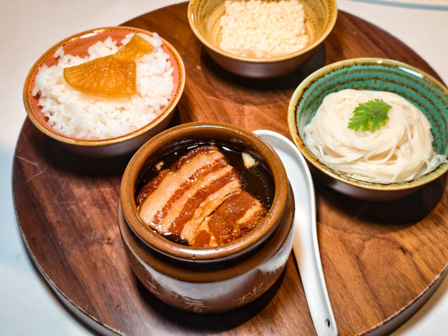 傳統菜色「天香東坡肉佐三御品」則將杭州菜講究「兩輕一清」,輕油、輕醬、清淡表現的十分完美,重視食材原汁原味,浸泡在湯汁的東坡肉略帶醬色,嚐起來卻不油膩,原來是製作時經過3次去油步驟,在保有肉質細膩感之餘,同時帶有油脂香氣,搭佐麵線、泡饃及米香一起享用,創造多元吃法。