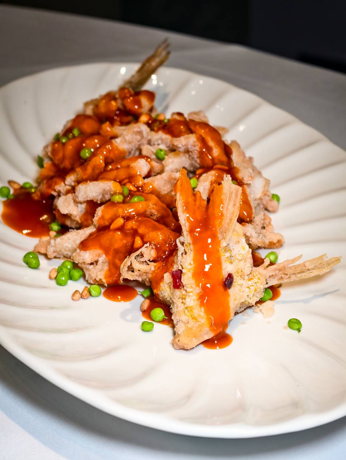 黃魚宴怎能少了大菜「松鼠黃魚」呢?愛吃「松鼠魚」的饕客相信都不陌生,松鼠魚為清代乾隆年間的宮廷名菜,據說乾隆皇帝南巡時曾在蘇州嚐過此菜,大為讚賞,故名揚天下。天香樓主廚路凱源(Lulu)發揮創意,有別傳統以桂魚為食材,改以當季鮮活黃魚取代,手工花刀片開魚身,小火酥炸定型,魚頭外型好似松鼠般活靈活現,雙目以蔓越莓點睛,再澆淋上特製糖醋醬提升香氣,翠綠色豌豆與鮮橙色醬汁賦予菜色滿滿活力,一口咬下外酥內嫩,完美呼應黃魚金鱗玉膚的美譽。