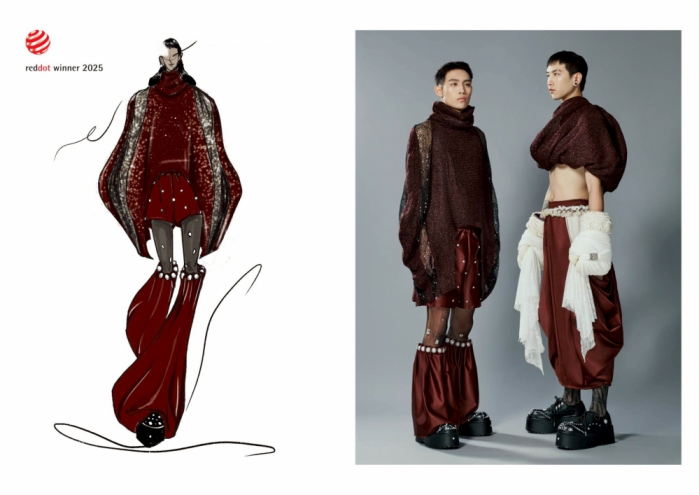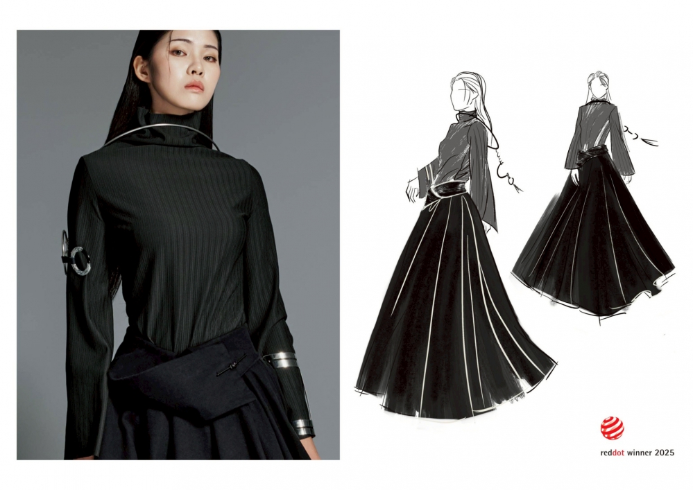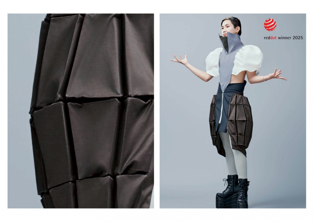服飾設計系更創佳績,古偉辰的《遡》挑戰性別刻板與父權結構,透過視覺符號與色彩語言,引發對性別平等的深層思辨;梁愷芯的《韻動》則展現中華文化的內在和諧之美,服裝設計兼具機能性與視覺層次,展現穿著者與自我之間的精神連結;陳語柃的《末日蟲塵》以極端氣候與昆蟲生存為靈感,結合機能面料與仿生設計,打造未來末日求生裝備,探討人與自然共生的新可能。