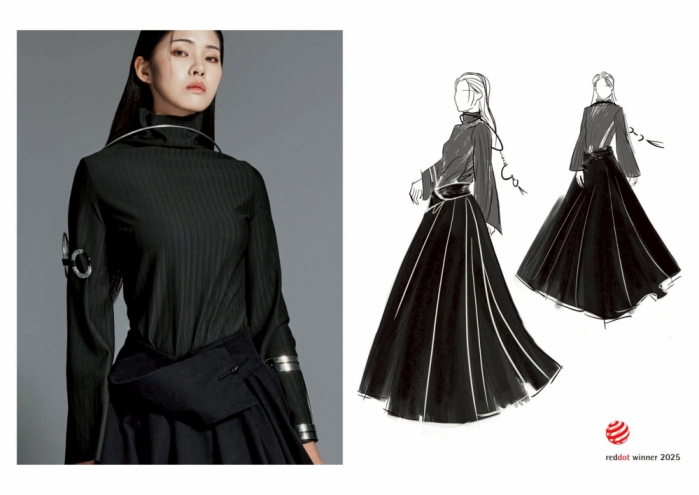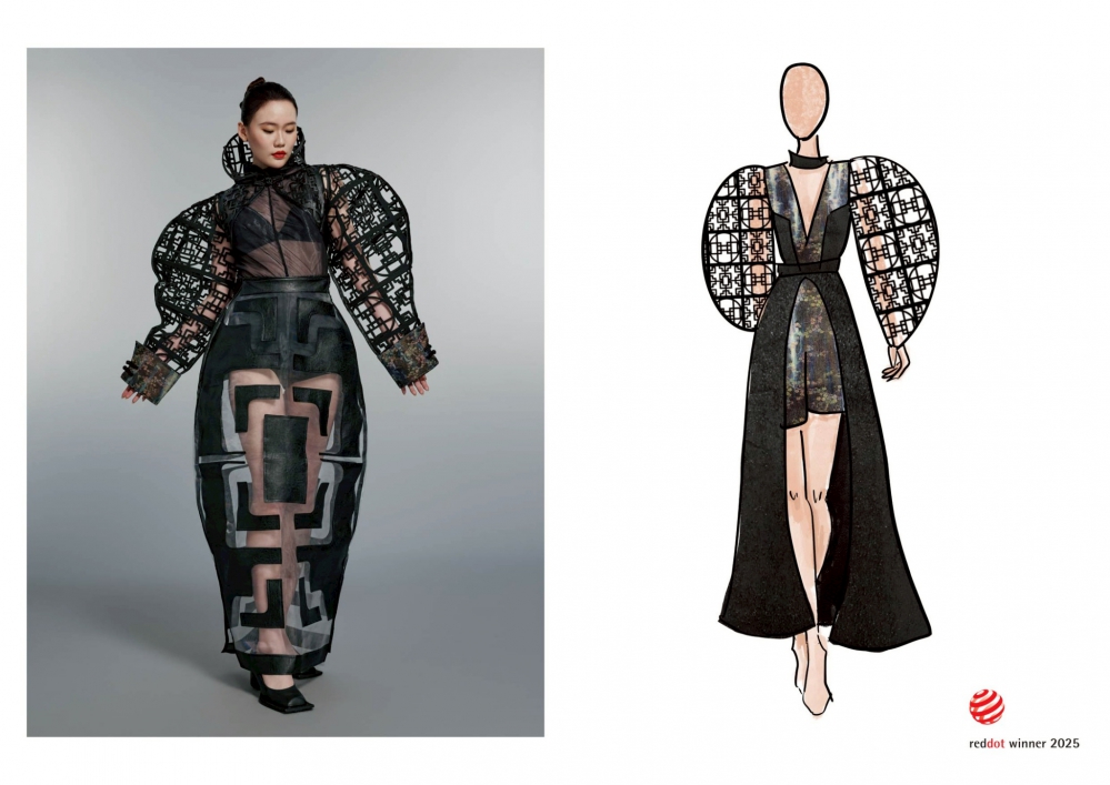 素來有最會得獎大學之稱的嶺東科大,今年共有三系在此次競賽中表現亮眼。在「時尚與配件」類別,來自流行設計系的蘇芳以,以作品《暗窗疏影》融合東西服飾元素與傳統鐵花窗意象,透過雷射雕刻技術展現光影交錯的動態美感,回應當代人對文化歸屬感的渴望,並呼應聯合國永續發展目標SDG 11與SDG 17,詮釋文化再生與國際合作的可能性。