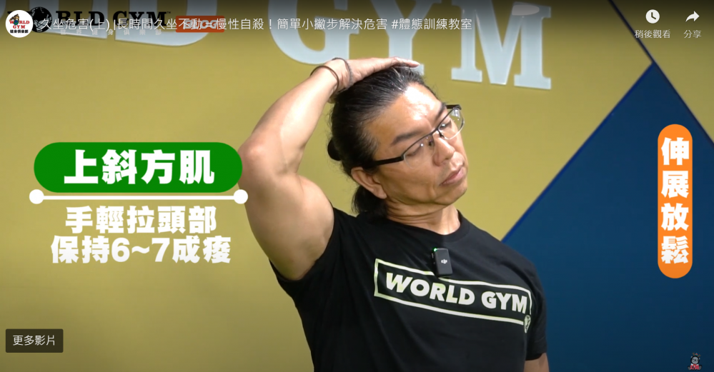 World Gym品牌公關經理廖容瑩指出,World Gym專業教育訓練官Ryan提醒,上班族不必等到下班才運動,只要利用工作間隙,抽3至5分鐘進行伸展,就能舒緩痠痛、激活代謝。