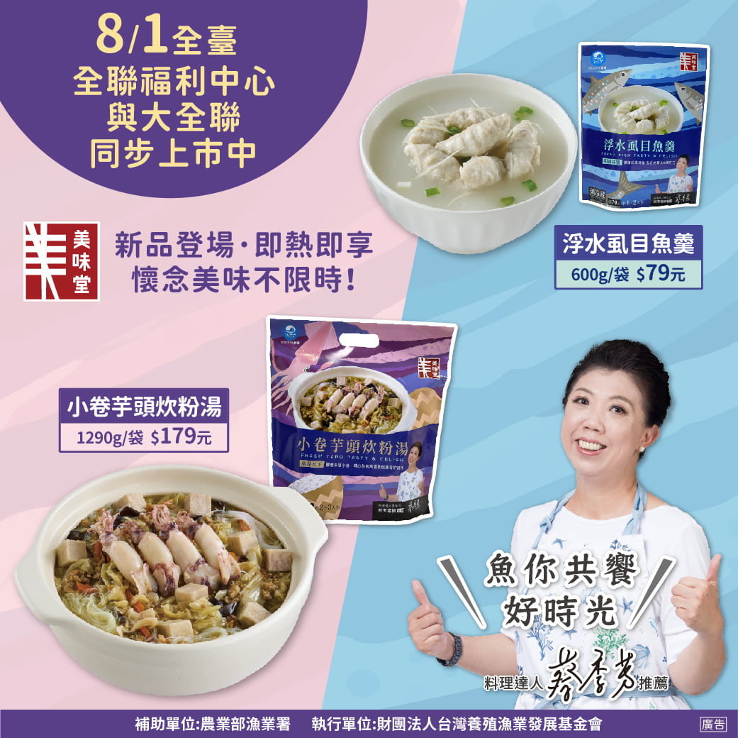 【記者 劉奕廷/台北 報導】為推廣國產水產品即食化、提升消費便利性與市場接受度,農業部漁業署攜手全聯福利中心自有品牌「美味堂」合作開發推出的兩款加熱即食新品─「浮水虱目魚羹」與「小卷芋頭炊粉湯」。嚴選臺灣在地海味,並由料理達人─蔡季芳老師監製,主打加熱即享美味、快速上桌,讓民眾在忙碌生活中,也能輕鬆感受一碗暖心熱食所傳遞的溫度與心意。8月1日起,將於全臺超過1,200家全聯福利中心與大全聯門市同步開賣,便利民眾在日常採買中輕鬆入手,隨時享用正港臺灣好滋味。