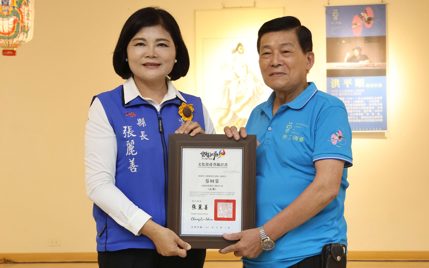 縣長張麗善為三位新登錄的無形文化資產保存者:侯順政、林山田及蔡炯容正式頒證。
