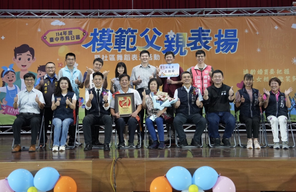 【記者林重鎣台中報導】父親節將至,臺中市烏日區公所2 日上午於僑仁國小舉辦「114年度臺中市烏日區模範父親表揚暨社區舞蹈表演活動」,臺中市政府交通局局長葉昭甫出席頒贈象徵父愛偉大的「父德光輝」獎牌,並轉達盧市長最誠摯的謝意,感謝每位爸爸用愛陪伴、辛勤付出,用堅挺的臂膀守護家庭,提醒爸爸們照顧家人的同時,也別忘了關心自己的健康,並獻上「父親節快樂」的祝福。