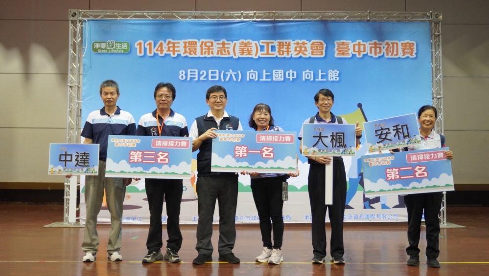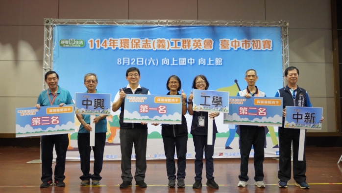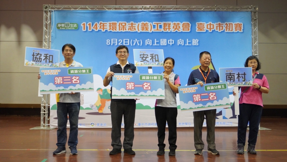 【記者林獻元台中報導】「114年環保志(義)工群英會台中市初賽」2日於向上國中熱鬧舉行,共有20組來自各區的環保志工隊伍,歷經「環保金頭腦」、「資源分類王」、「資源灌籃高手」以及「清掃接力賽」四大關卡競爭拚搏,最終由西屯區協和志工隊、安和志工隊、南區工學志工隊及大雅區大楓志工隊奪下四項競賽冠軍,將代表台中市參加11月份於雲林舉行的全國環保志(義)工群英會。