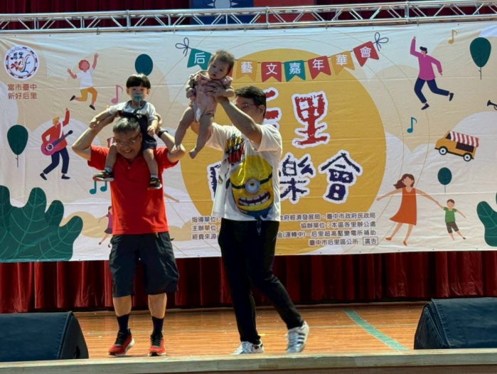 后里區公私立托幼機構的小朋友,首進行才藝表演競賽,萌力十足的歌舞演出為活動揭開序幕。另一亮點「三代同堂創意show」由本區各里祖孫三代組隊參與,結合家庭故事與服裝創意,讓大小朋友攜手走上舞台,展現后里社區的溫馨日常與創意巧思。