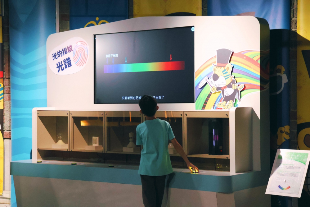 歷險」;以故事呈現炭火、日光燈、LED 紅綠燈與螢火蟲等常見光源背後發光原理的「發光大揭祕」;觀察不同光源光譜變化、認識光在生活場域中多元應用的「光的指紋」。所有內容皆巧妙融合太陽能、光電、光譜等科學知識,同時搭配生動有趣的情境動畫,為參觀者營造豐富的感官體驗。