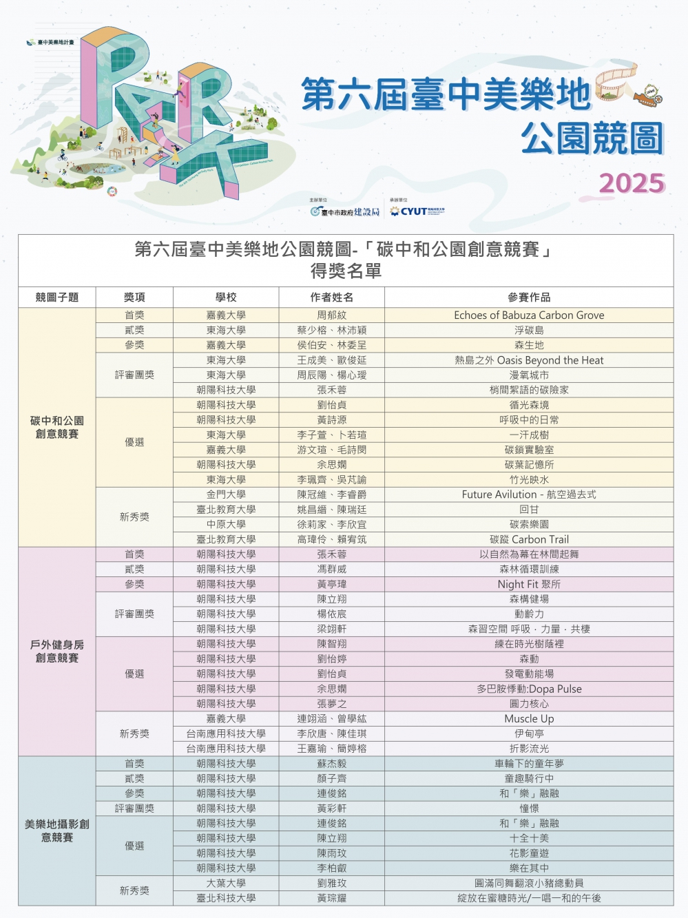 為鼓勵首次參與的學校,更特別新增「新秀獎」,充分展現全台青年學子在創意設計、永續理念與城市美學上的卓越表現;期盼透過本次競圖不僅能培養更多未來城市設計人才,也能引發社會對碳中和、公園功能及公共空間價值的關注與討論。