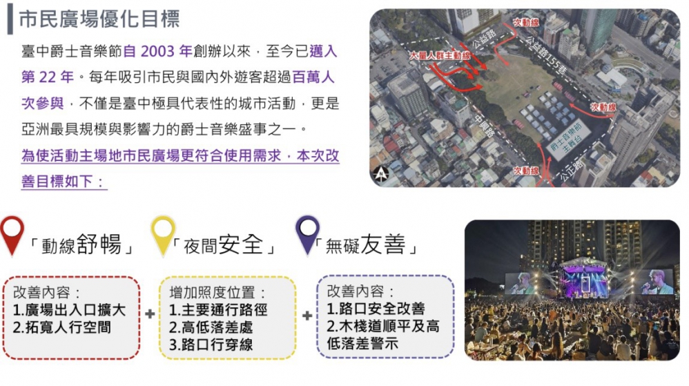 此次優化後,人流動線將由2米寬加大為6米至10米寬,也將凸字型或老舊影響動線的木平台及花崗石材質座椅拆除移設,提供更平順寛闊的無障礙通行環境;另考量照明安全,也提前將舊式LED燈更換為新式更節電的高照度LED燈,優化工程預計9月底前完成。