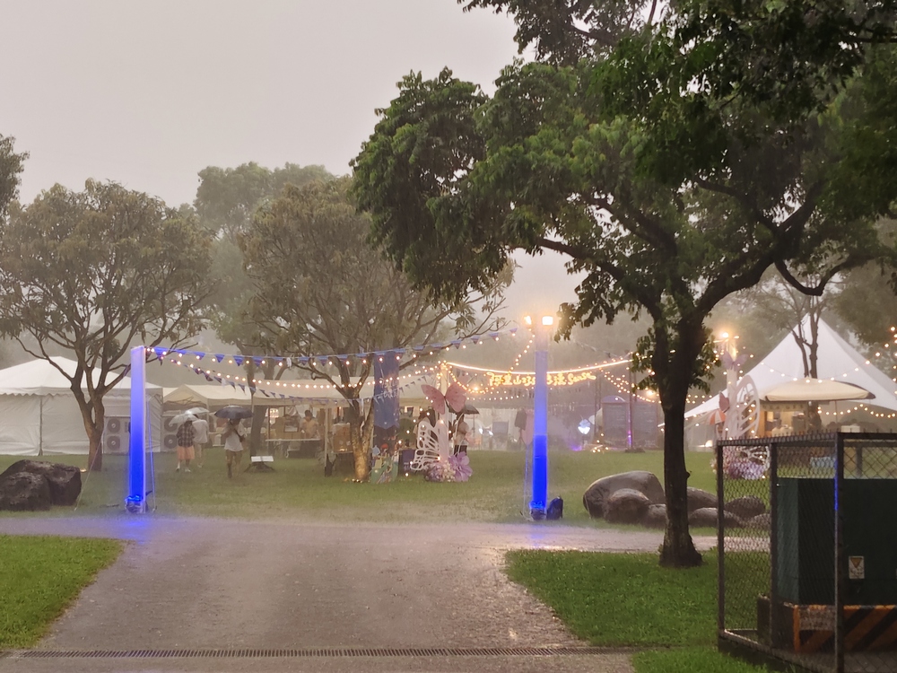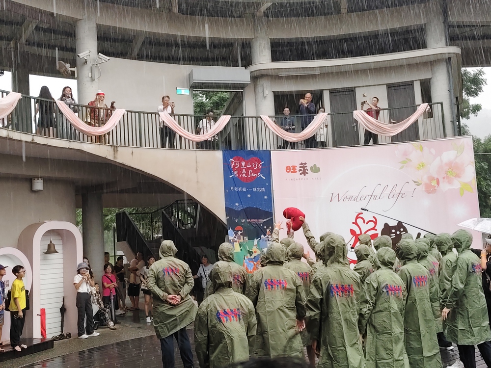拋繡球活動第一天正逢大雨滂沱,繡球依然在雨幕中搖曳,不減參與者熱情。(圖/記者任芳葵攝)