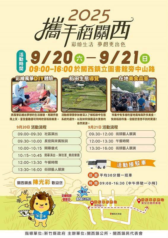 而最值得期待的,莫過於9月20日(六)、21日(日)09:00–16:00 於關西鎮立圖書館旁中山路舉行的市集活動!現場將有彩繪風箏DIY體驗、稻田生態導覽、在地美食品嚐,以及街頭藝人展演。兩日現場將有:彩繪風箏DIY體驗:親手彩繪、親子同樂,放飛夢想。