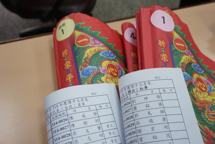 連日來,事務人員整理、核對普度法會登記名冊,黏貼普度旗的編號及信眾姓名,進行先期作業。