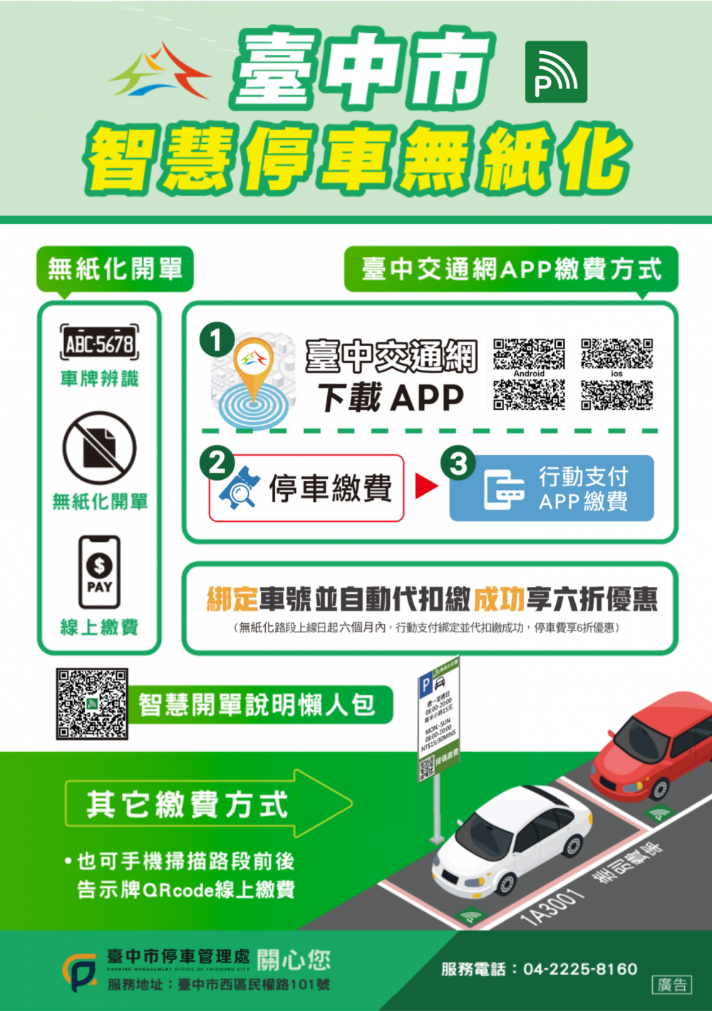 交通局提醒,民眾只要將車號綁定行動支付APP(如iPASS MONEY、街口支付、車麻吉、Pi拍錢包、停車大聲公、歐付寶、全支付、悠遊付、icash Pay、橘子支付等),於無紙化車格自動代扣繳費用,即可享最高「6折」優惠(優惠期間為上線日起6個月內)。若綁定金融機構、電信業者及遠通電收代扣繳,則可享8折優惠。民眾亦可透過「臺中交通網」APP查詢停車資訊與優惠內容。