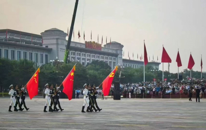 大陸九三閱兵於上午9點登場,80響禮炮與護旗隊進入天安門廣場。升旗典禮由解放軍儀仗司禮大隊編隊正步入場,從天安門廣場前的大陸人民英雄紀念碑,朝升旗台方向前進。