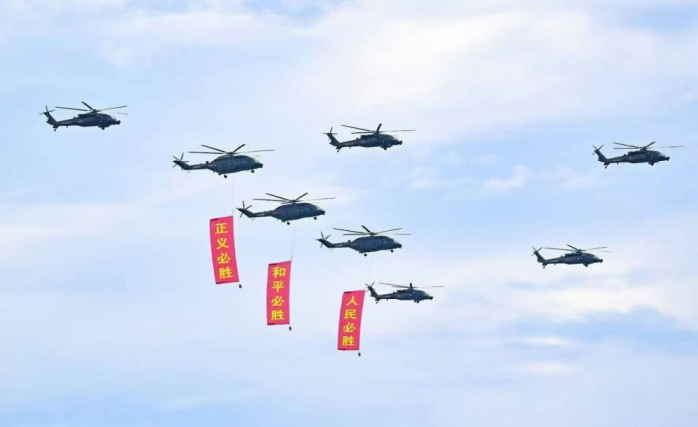 解放軍空中護旗梯隊於9點45分率先登場,由東向西,以既定的編組隊形飛越天安門廣場,據了解,吊掛小組共吊掛三面旗幟和正義必勝、人民必勝和和平必勝三幅橫幅。
