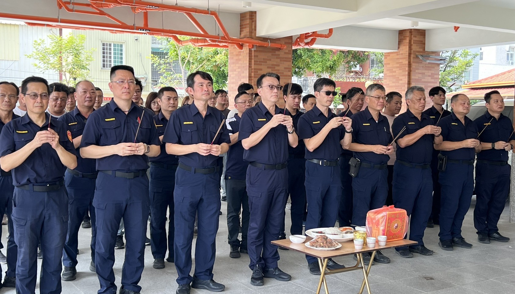 新落成啟用的雲林縣西螺分局首次舉行普渡祭典,由分局長閻百川率領全體同仁齊聚一堂,虔誠焚香祈福。(圖/記者蘇峯毅攝)