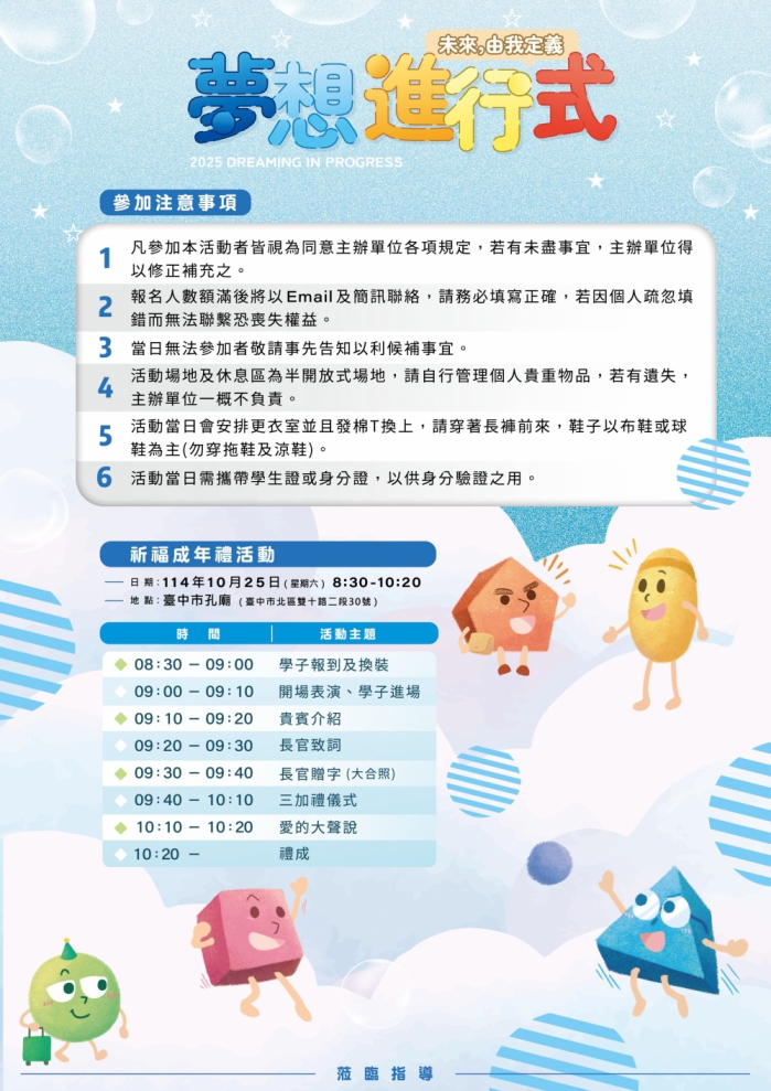 活動以五種動態形象來描繪學子在成長過程中的多元、獨特及探索,其中有人拖著行李,象徵啟程;有人雀躍跳起,展現對未來的憧憬;也有人交談分享夢想,傳遞彼此的力量滿彼此相遇於人生車站,期許每位學子帶著不同的夢想與勇氣,用自己的行動定義自己的未來。