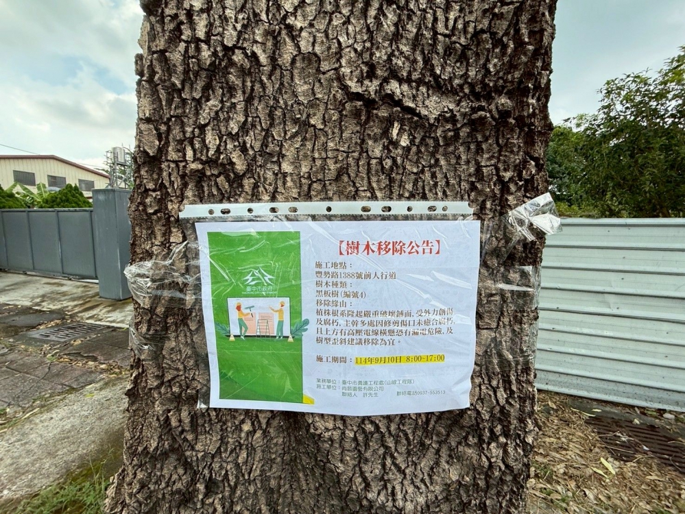 【記者林獻元台中報導】為改善石岡區豐勢路沿線人行道因黑板樹浮根外露造成的破損情況及樹木受感染病株問題,並排除黑板樹高度過高與高壓電線重疊所帶來的公共安全風險,市府建設局將於10日進行豐勢路1388號至1380號前8株黑板樹換植作業,並配合人行道改善工程,更新鋪面、調整路寬至約2.6公尺,打造更安全、友善的通行空間。