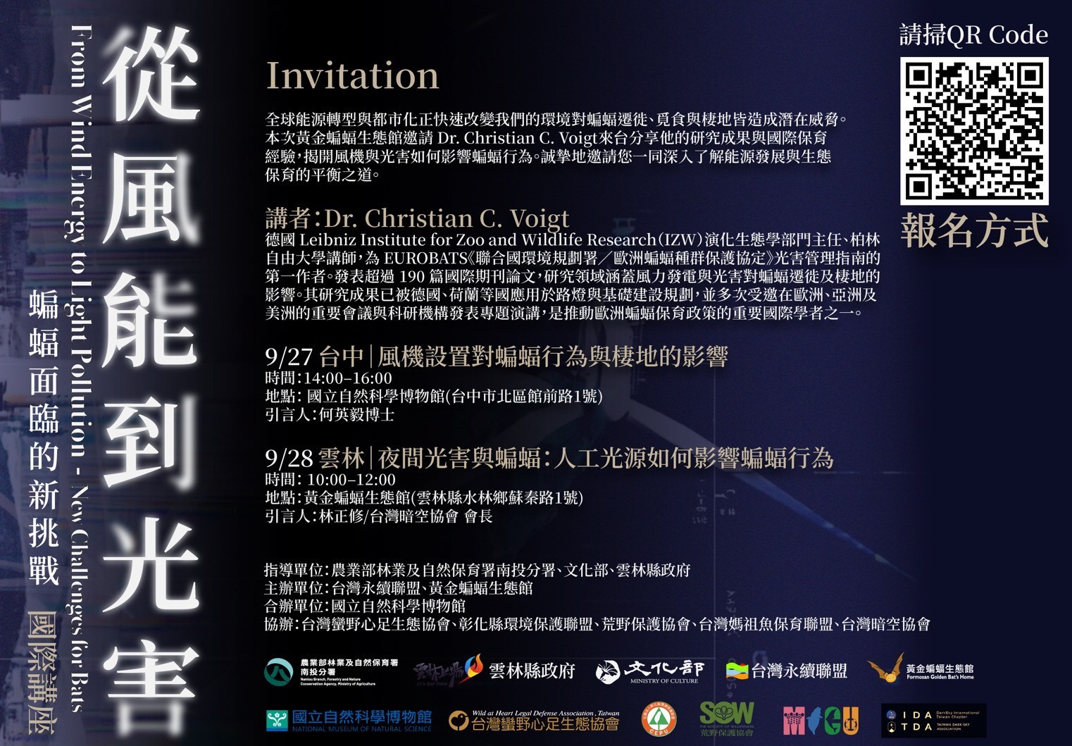 【記者蘇峯毅/雲林報導】農業部林業及自然保育署南投分署攜手黃金蝙蝠生態館及台灣永續聯盟,將於9月27日在台中國立自然科學博物館、9月28日在雲林黃金蝙蝠生態館舉辦「從風能到光害-蝙蝠面臨的新挑戰」國際講座,特別邀請歐洲蝙蝠保育領域重量級學者 Dr. Christian C. Voigt 首度來台,與國內外專家交流能源開發與生態保育議題。活動免費參加並提供口譯,名額有限,鼓勵民眾踴躍報名。