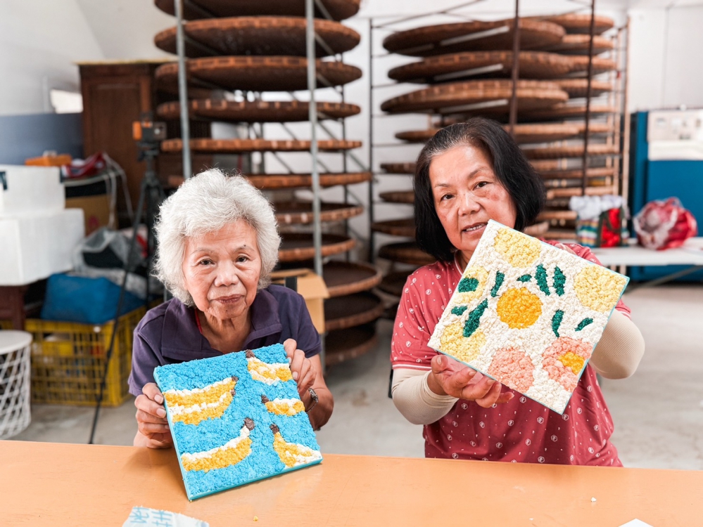 設計過程中融合社區在地元素,抽藤坑溪石、紅磚牆面、新社花卉與水果、社區街廓等,並結合綠色照顧計畫課程,由一方邸共創工作室專業指導,讓長輩直接參與設計與創作。抽藤坑溪石化為抿石子牆面、紅磚牆與街廓意象延伸成壁面裝飾,長輩將新社花卉水果意象做成馬賽克拼貼及紙漿畫,將地方風貌巧妙融入設計,讓長輩參與翻新空間。