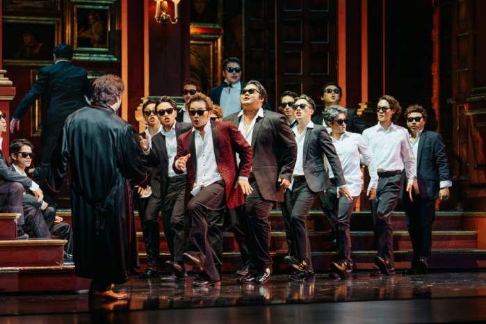 《弄臣》裡有一群存在感超強的男團,原本是公爵身邊的狐群狗黨,在宴會上高歌慶祝,把歡樂氣氛炒到最高,但轉身就成為綁架弄臣愛女的黑道兄弟,獻上獵物給「公爵老大」辣手摧花。這群「反派男團」由NTT╳勇源歌劇合唱團參與演出,從音樂、戲劇、舞蹈進行長達一個月培訓,從美聲唱腔到舞台走位,從肢體語言到眼神演技,要讓他們不只唱得好,還要演得壞!