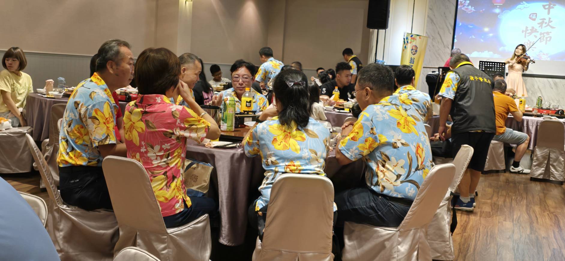 中秋佳節溫馨洋溢、翁子警友站團隊於晚間舉辦「中秋聯誼餐會」、現場燈光璀璨、笑語不斷、氣氛熱鬧非凡、最引人注目的莫過於李站長率領的團隊、全體穿著統一設計的「海洋風」團體服裝、蔚藍色調搭配花圖案與點點白、宛如將夏日海風吹進會場、瞬間點亮整場活動。