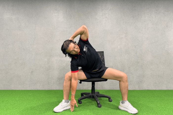 2、腰方肌伸展:坐在椅子上,雙腳踩地,左手放在頭後支撐,右手自然下垂,收緊腹部以保持骨盆穩定。接著將身體緩緩向右側傾倒,直到左側腰部感受到被拉伸。動作維持15-30秒並深呼吸,每側重複2-3次。