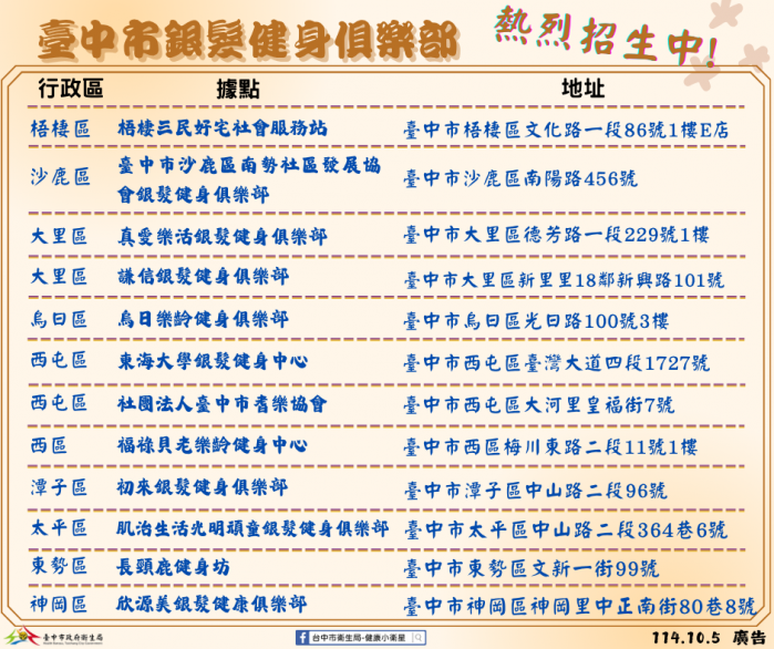 【記者林獻元台中報導】為降低長者衰弱風險、提升肌力,中央與地方政府近年積極推動「銀髮健身俱樂部」,讓長輩就近運動,並成為交流陪伴的友善空間。台中市政府衛生局長曾梓展5日表示,台中市自109年起向中央爭取設立,迄今已布建18處據點,今年再獲衛福部核定補助10處,持續打造「齡健康城市」。