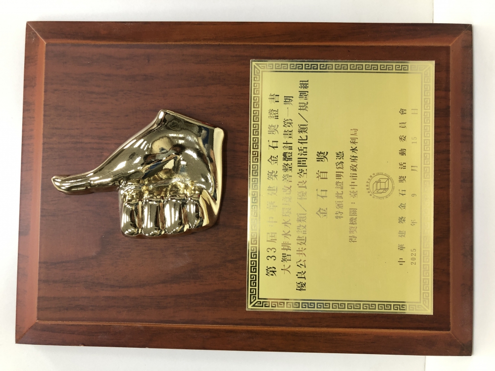 水利局強調,市長盧秀燕高度重視台中市水環境建設,也感謝水利署經費挹注,此次榮獲金石首獎,不僅是評審對水利規劃團隊的再次肯定,更展現市府在宜居城市發展上的努力成果。