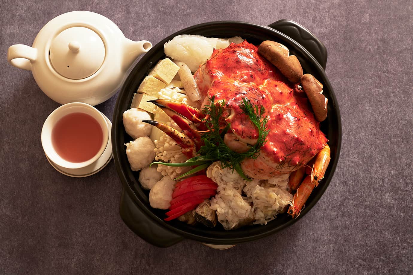 全席最大亮點莫過於「乾隆帝王百寶鍋」。以超過28小時慢火熬煮的老母雞高湯為底,湯色金黃澄澈、滋味厚實甘醇。帝王蟹身鎮場,豪邁搭佐白蝦、花膠、黑魚皮、虱目魚丸與菇菜等珍饈,澎湃豪華,鮮美濃郁,儼然滿漢全席般的尊榮氣勢,堪稱全桌壓軸。