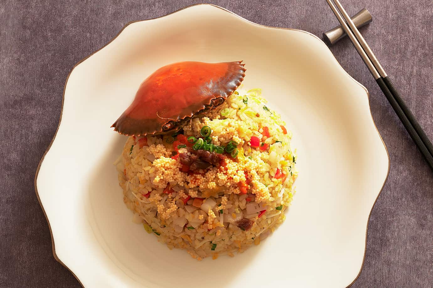 開場迎賓碟三品,以蘋果和風蟹肉、脆皮燒肉、洛神鮑魚干貝凍為序曲,清新開胃;「清蒸玉露帝王蟹」蟹腳肉襯魚露與蔥花,蒸出極致原味;「魚翅桂花麵包蟹」以整隻麵包蟹搭配魚翅、桂花與香菇絲,口感細膩豐潤;「蟹蟹平安灌湯包」則以大閘蟹黃與帝王蟹肉入餡,湯汁濃郁齒頰生香;「踏雪蟳梅飛魚飯」將紅蟳與飛魚卵、紫蘇梅巧妙結合,火候與蛋香交織出酸甜鮮美的多重風味。